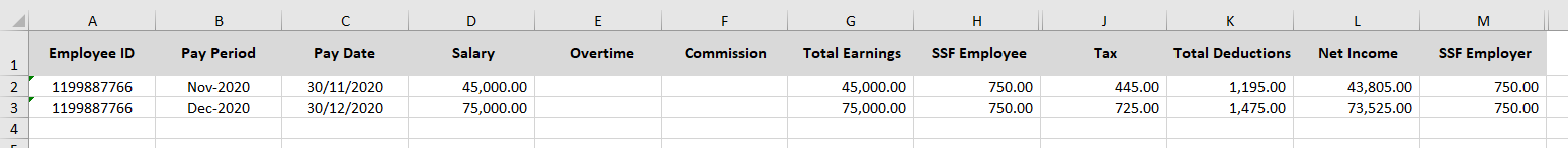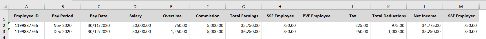 - ค่าล่วงเวลา 750 บาท - ค่าคอมมิชชั่น 5,000 บาท - ประกันสังคม 750 บาท - ภาษี 225 บาท - เงินได้สุทธิ 34,775 บาท เดือนธันวาคม 2563 - เงินเดือน 30,000 บาท - ค่าล่วงเวลา 1,250 บาท - ค่าคอมมิชชั่น 5,000 บาท - ประกันสังคม 750 บาท - ภาษี 250 บาท - เงินได้สุทธิ 35,250 บาท |