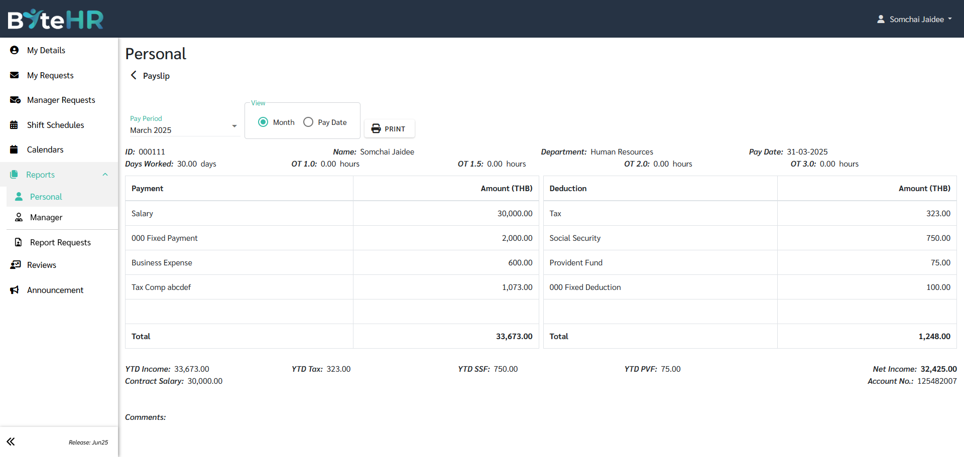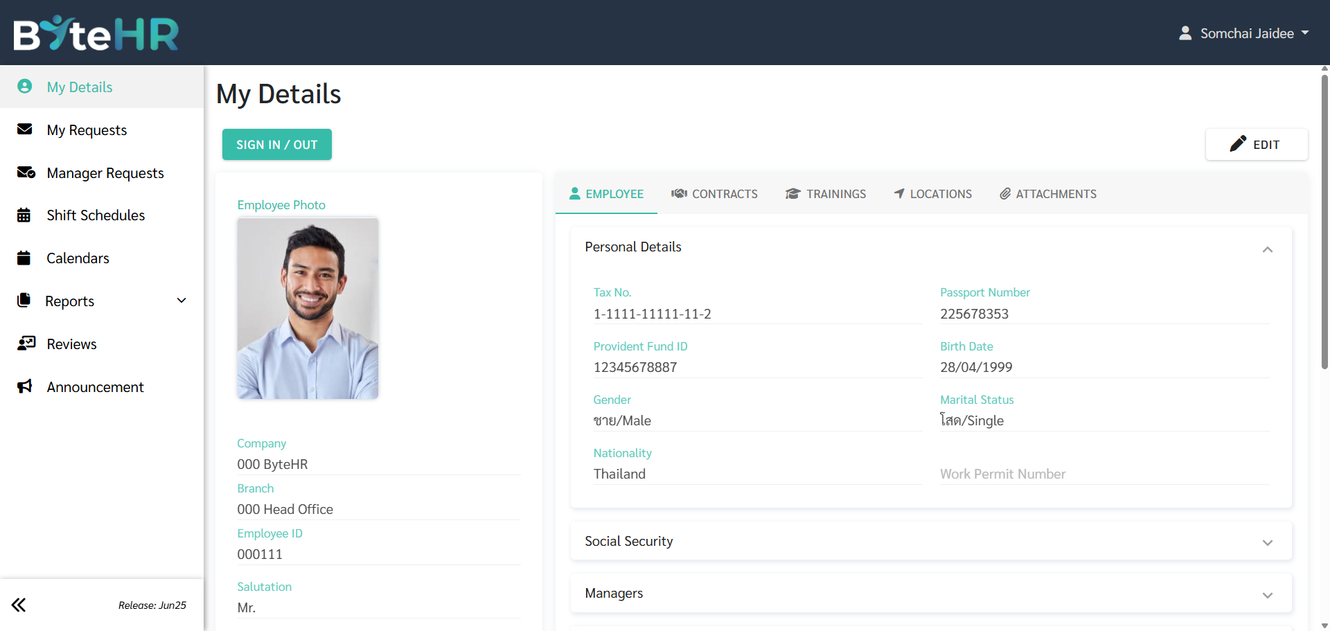 จะแสดงข้อมูลส่วนตัวของพนักงาน เช่น บริษัท, สาขา. รหัสพนักงาน, ชื่อ-นามสกุล, เลขประจำตัวผู้เสียภาษีอากร, ชื่อหัวหน้างาน, รายละเอียดบัญชีสำหรับโอนเงินเดือน, รายละเอียดกองทุนสำรองเลี้ยงชีพ เป็นต้น