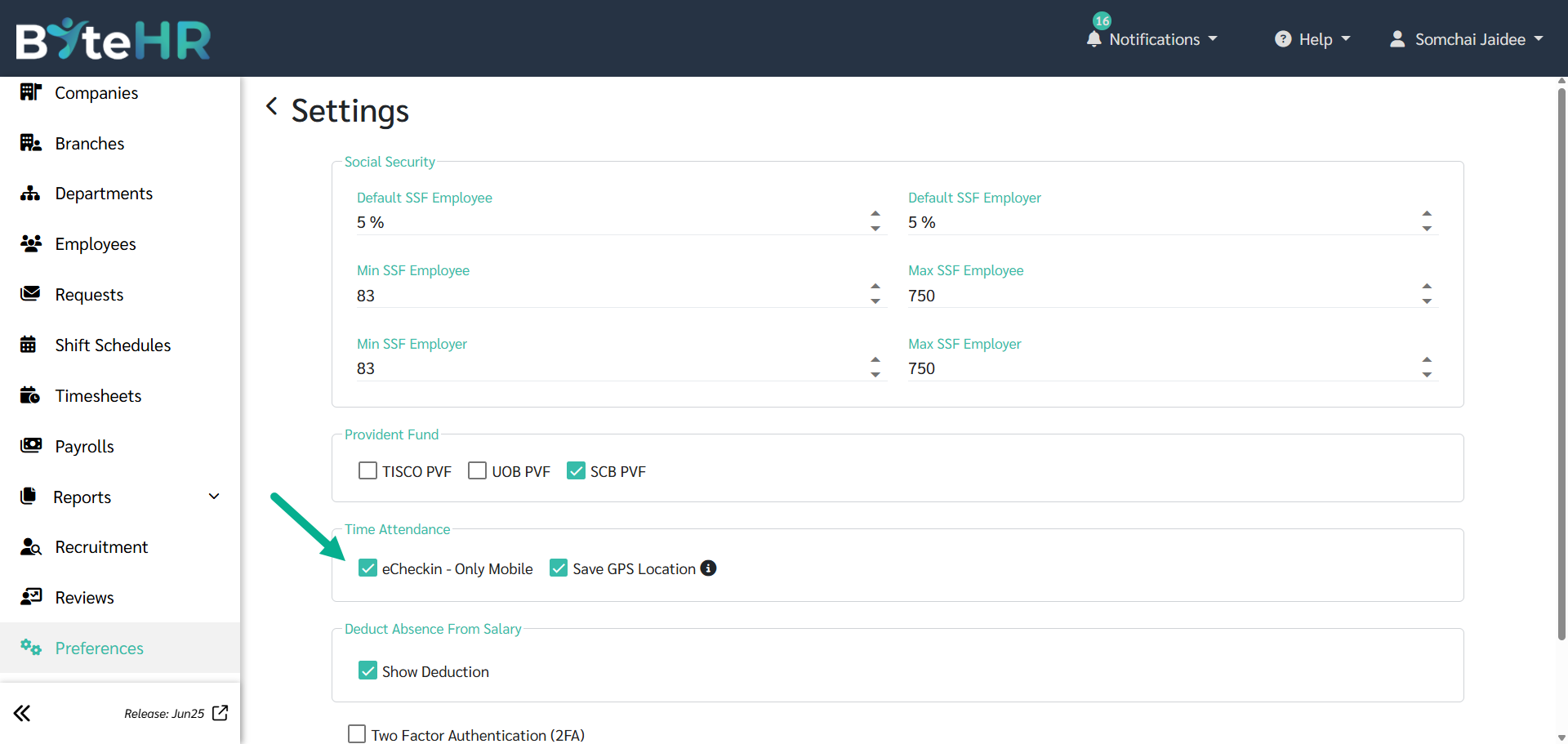 หากแอดมินไม่ต้องการให้พนักงานลงเวลาผ่านเว็บแอป ต้องการให้พนักงานลงเวลาผ่านมือถือเท่านั้น แอดมินสามารถไปที่เมนู การตั้งค่า (Preferences) -> บัญชี (Account) -> การตั้งค่า (Settings) -> จากนั้นติ๊กที่ตัวเลือก ใช้ eCheckin ในโทรศัพท์อย่างเดียว (eCheckin - Only Mobile)