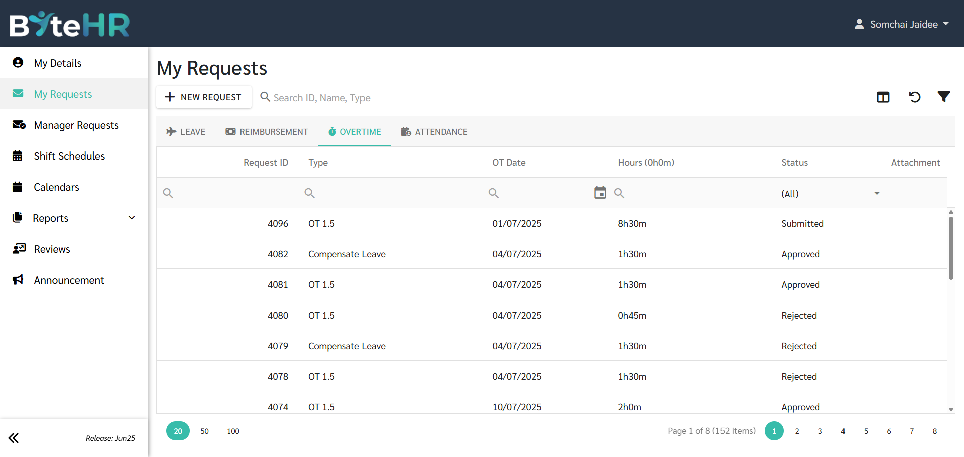 พนักงานสามารถส่งคำร้องขอวันลา, คำร้องขอเงินคืน, คำร้องขอค่าล่วงเวลา และคำร้องตารางการทำงานได้ โดยคลิกที่ คำร้องใหม่ (New Request)