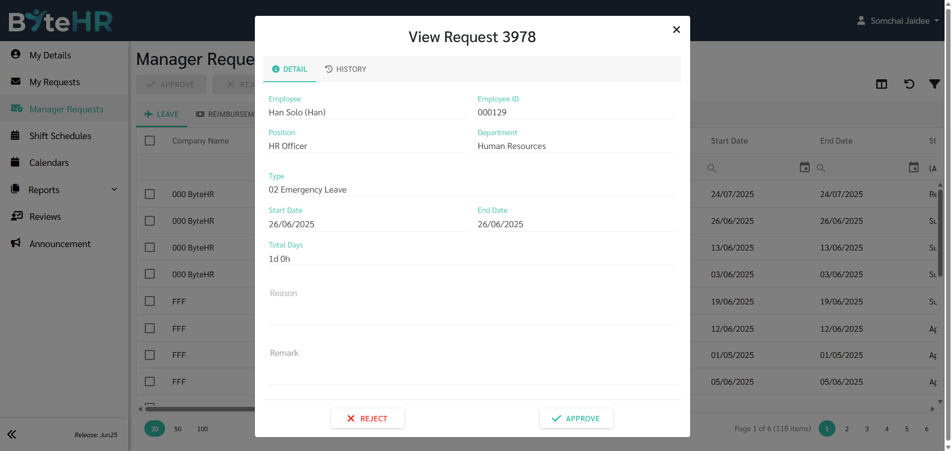 กรณีที่พนักงานเป็นผู้จัดการ/หัวหน้างานและมีลูกน้อง จะสามารถเห็นคำร้องต่างๆ ของลูกน้องได้ รวมทั้งสามารถ อนุมัติ (Approve) หรือ ไม่อนุมัติ (Reject) คำร้องได้