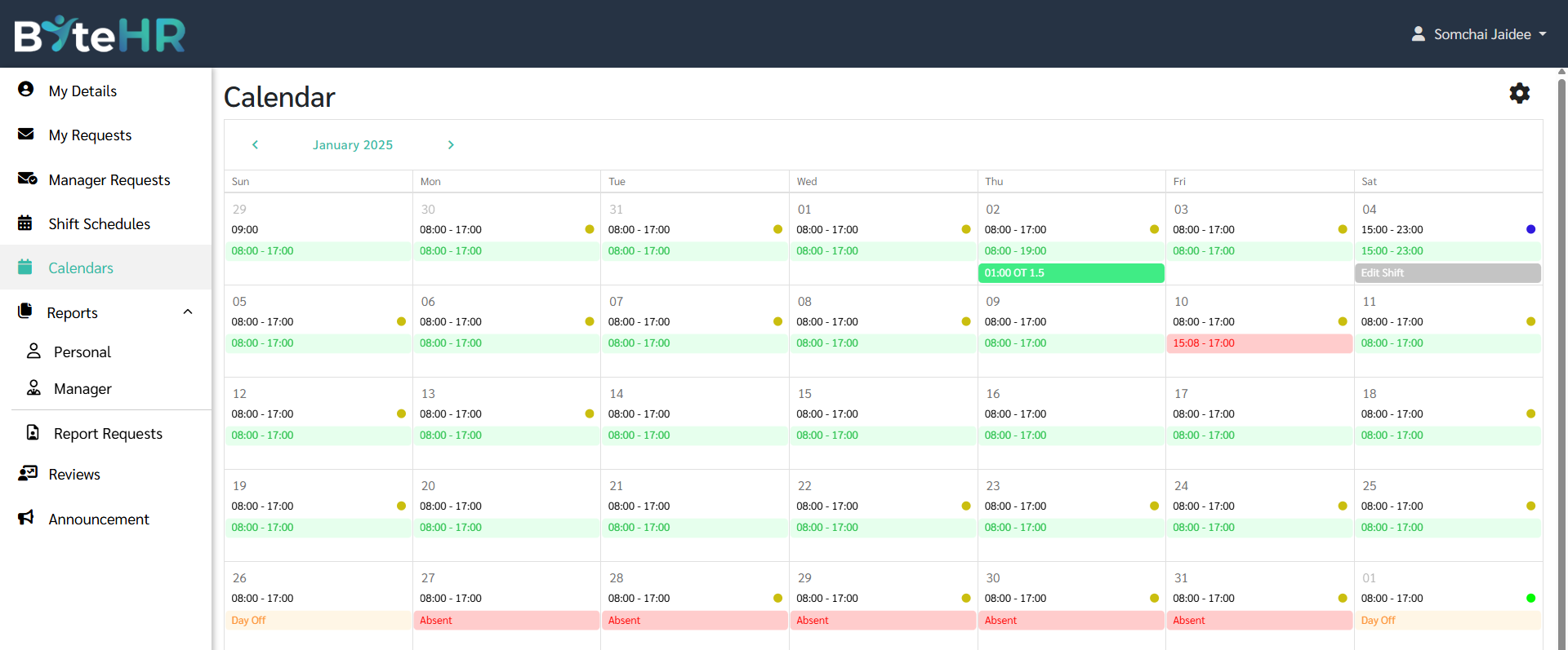พนักงานสามารถดูปฏิทินตารางการทำงานที่แสดงรายละเอียดต่างๆ เช่น เวลาเข้างาน/เลิกงานในกะ, เวลาลงชื่อเข้างาน/เลิกงาน, วันหยุดประจำสัปดาห์, วันหยุดนักขัตฤกษ์, วันลา, เปลี่ยนกะ เป็นต้น