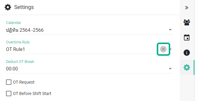 หากไม่ต้องการแนบกฏค่าล่วงเวลาในตารางกะ ให้คลิกกากบาทที่ กฏค่าโอที (Overtime Rule)