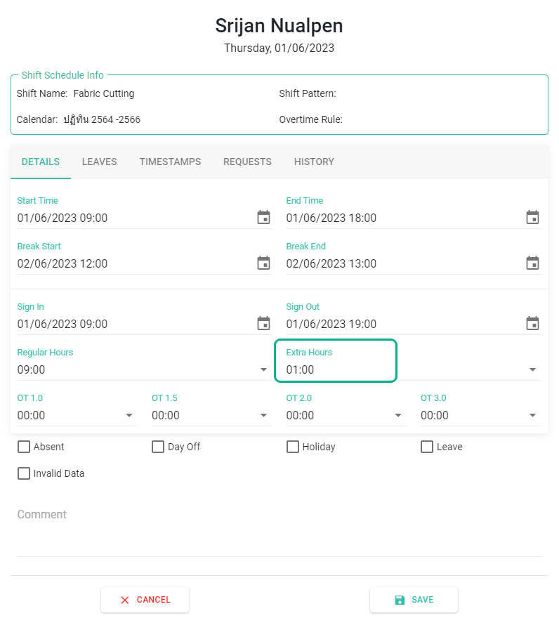 ระบบจะคำนวณจำนวนชั่วโมงที่ทำเกินเวลากะและแสดงในช่อง จำนวนชั่วโมงเกินเวลาปกติ