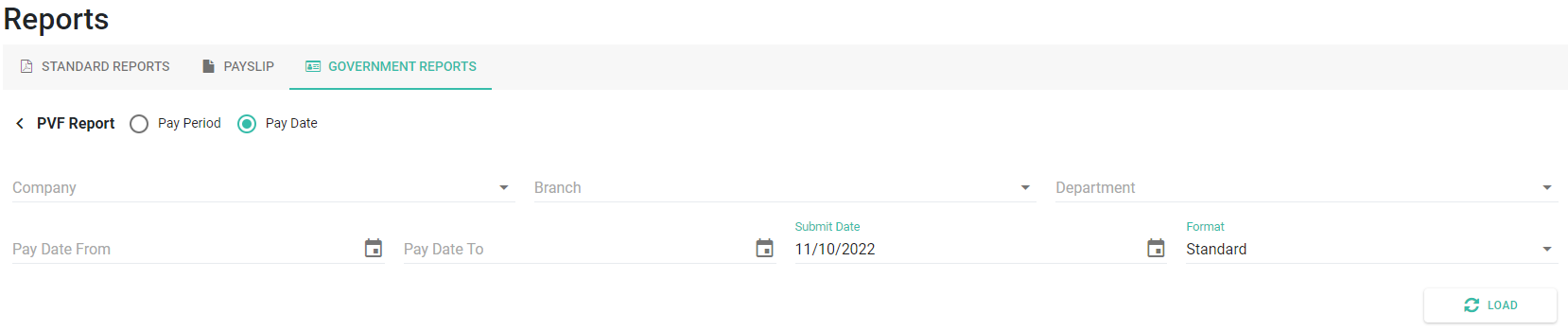 5. เลือก บริษัท (Company) สาขา (Branch) แผนก (Department) ระยะเวลาการชำระเงิน (Pay Period) หรือ วันจ่ายเงินตั้งแต่ (Pay Date From) ถึง วันจ่ายเงินถึง (Pay Date To) วันที่ยื่น (Submit Date) และ รูปแบบ (Format) ของข้อมูลที่ต้องการเรียกดู