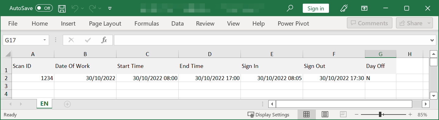 7. กรอกข้อมูลในไฟล์ Excel ได้แก่ รหัสสแกนนิ้ว(Scan ID), วันที่ทำงาน(Date Of Work), เวลาเริ่มต้น(Start Time), เวลาสิ้นสุด(End Time), ลงเวลาเข้า(Sign In), ลงเวลาออก(Sign Out) และ วันหยุด(Day Off) หากเป็นวันหยุดให้ใส่ Y หากไม่ใช่ให้ใส่ N