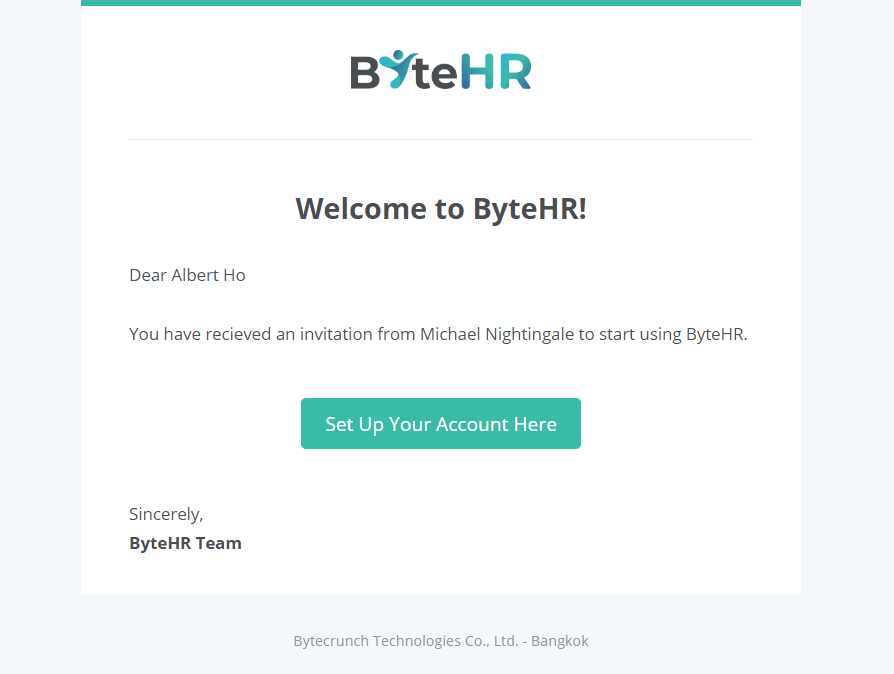 8. ระบบจะส่งอีเมลไปให้พนักงานเพื่อเข้าใช้งานระบบ ByteHR App โดยให้พนักงานคลิกที่ Set Up Your Account Here