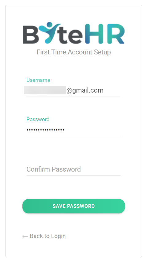 9. เมื่อสร้างรหัสผ่านเสร็จเรียบร้อย ให้คลิกที่ Save Password เพื่อบันทึกรหัสผ่าน ระบบจะแสดงหน้าจอให้ Log in เพื่อเข้า ByteHR App ให้ใส่อีเมลและรหัสผ่านและคลิกที่ Login เพื่อเข้าระบบ ByteHR