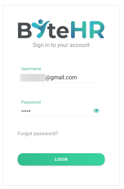 10. เมื่อสร้างรหัสผ่านเสร็จเรียบร้อย ให้คลิกที่ Save Password เพื่อบันทึกรหัสผ่าน ระบบจะแสดงหน้าจอให้ Log in เพื่อเข้า ByteHR App ให้ใส่อีเมลและรหัสผ่านและคลิกที่ Login เพื่อเข้าระบบ ByteHR