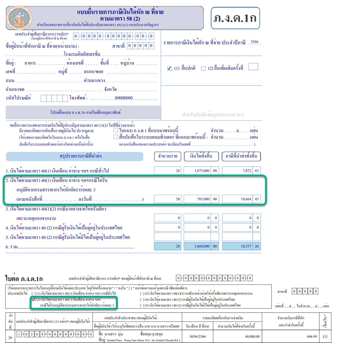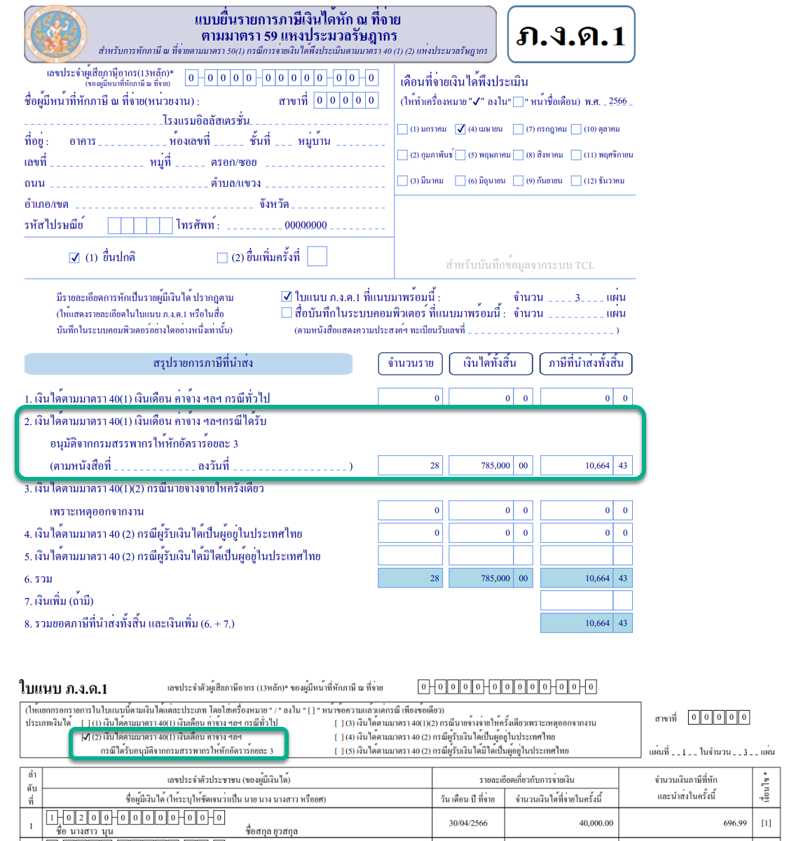 รายงาน ภงด.1 และ ภงด.1ก จะแยกแสดงระหว่างเงินได้ตามมาตรา 40(1) กรณีทั่วไป และตามมาตรา 40(1) กรณีได้รับอนุมัติจากกรมสรรพากรให้หักอัตราร้อยละ 3 ดังนี้