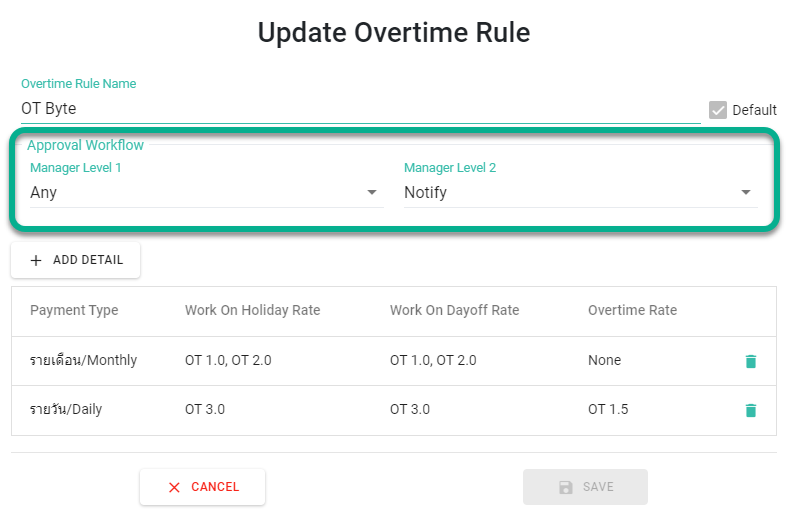 - คลิกที่ปุ่มแก้ไข เพื่อตั้งค่ากฏค่าล่วงเวลา หรือ เพิ่ม (Add) เพื่อสร้างกฏค่าล่วงเวลาใหม่