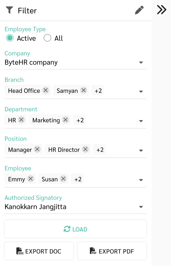 5. เลือก บริษัท (Company) สาขา (Branch) แผนก (Department) ตำแหน่ง (Position) พนักงาน (Employee) ลายเซ็นผู้มีอำนาจลงนาม(Authorized Signatory) ที่ต้องการ