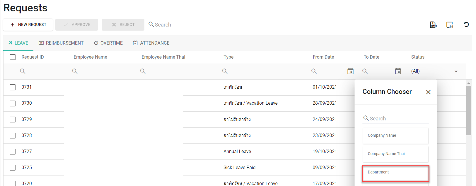 ○ คุณสามารถเลือกคอลัมน์แผนกจากตัวเลือกคอลัมน์มาแสดงในหน้าร้องขอได้