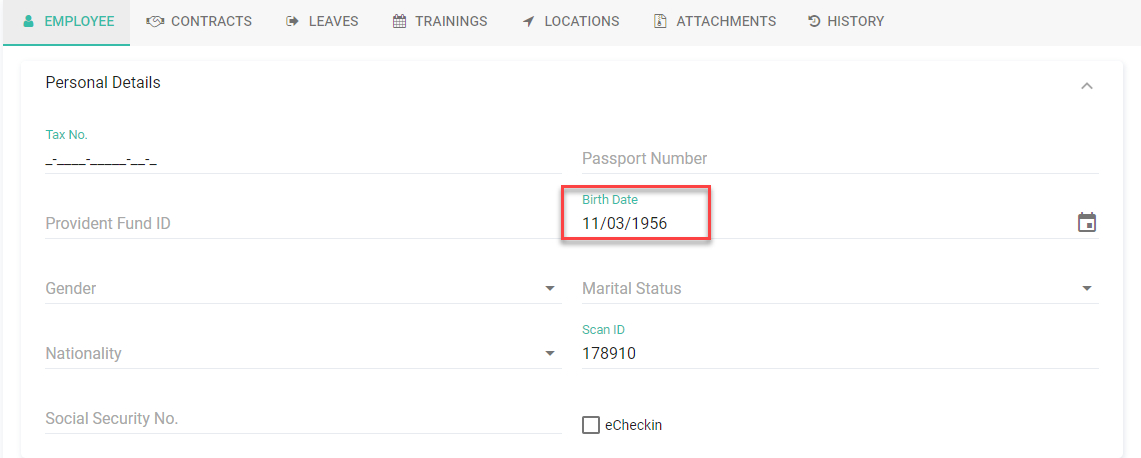 ตัวอย่าง : พนักงานเกิดวันที่ 11/03/1956 เมื่อใส่ข้อมูลวันเกิดในสัญญาจ้างพนักงานเรียบร้อยแล้ว ระบบจะคำนวณอายุของพนักงานจนถึงปีปัจจุบัน หากพนักงานมีอายุ 65 ปีหรือมากกว่า 65 ปี ระบบจะแสดงค่าลดหย่อน เงินได้ที่ได้รับยกเว้นกรณีคนที่มีอายุตั้งแต่ 65 ปีขึ้นไป / Income Exemption for Taxpayer Aged 65 Years or Older จำนวน 190,000 บาท ให้อัตโนมัติ
