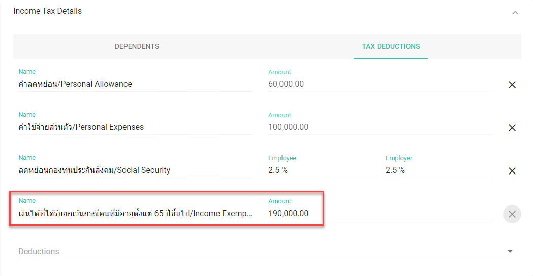 ระบบจะคำนวณอายุของพนักงานจากปีเกิดตามที่ระบุไว้ในช่องวันเดือนปีเกิด (Birth Date) จนถึงปีปัจจุบัน หากพนักงานอายุตั้งแต่ 65 ปีขึ้นไป ระบบจะแสดงเงินได้ที่ได้รับยกเว้นนี้ให้อัตโนมัติในส่วนของค่าลดหย่อน (Tax Deduction) และแสดงในชื่อ เงินได้ที่ได้รับยกเว้นกรณีคนที่มีอายุตั้งแต่ 65 ปีขึ้นไป (Income Exemption for Taxpayer Aged 65 Years or Older)
