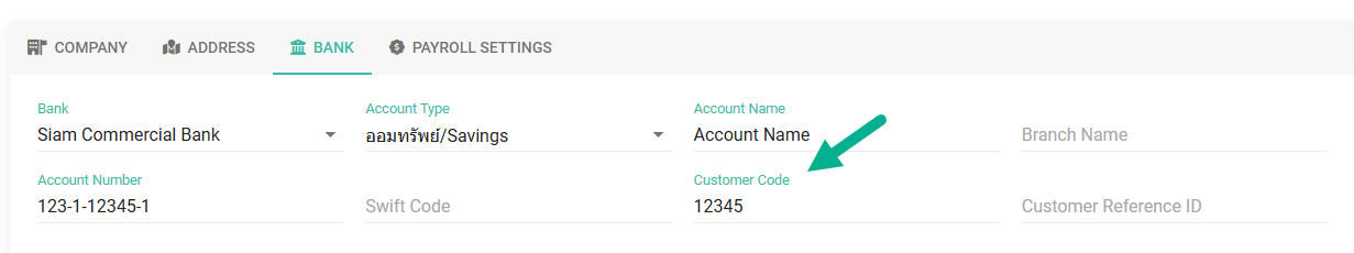 ○ สำหรับบริษัทที่ใช้บริการ SCB Business.Net ต้องกรอก รหัสลูกค้า(Customer Code) ที่เมนู บริษัท(Companies) -> แถบ ธนาคาร(Bank)