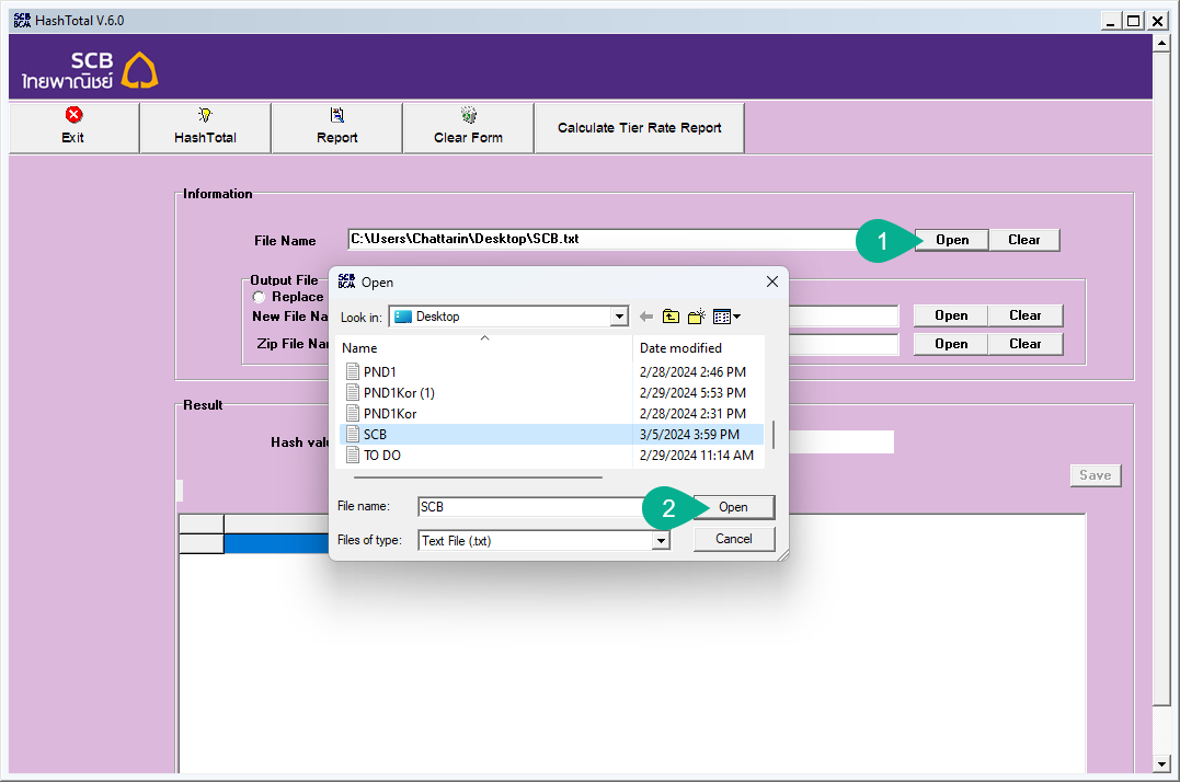 2. ที่หัวข้อ File Name -> คลิกปุ่ม Open -> จากนั้นเลือกไฟล์ธนาคารที่นำออกจากระบบ ByteHR