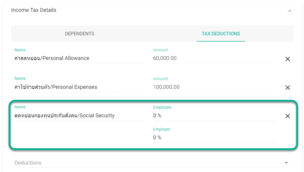 คำถาม : ในกรณีของกรรมการบริษัท/พนักงานที่ไม่ต้องเสียประกันสังคม แต่ต้องการให้รายงานประกันสังคม (สปส.1-10) แสดงรายชื่อของกรรมการ/พนักงานที่ไม่ต้องเสียประกันสังคมด้วย โดยแสดงแต่เงินได้และประกันสังคมเป็น 0 บาท ทำอย่างไรคำตอบ : ในสัญญาจ้างของพนักงานจะต้องเพิ่มค่าลดหย่อนประกันสังคมแต่ให้เปลี่ยนอัตราประกันสังคมเป็น 0%