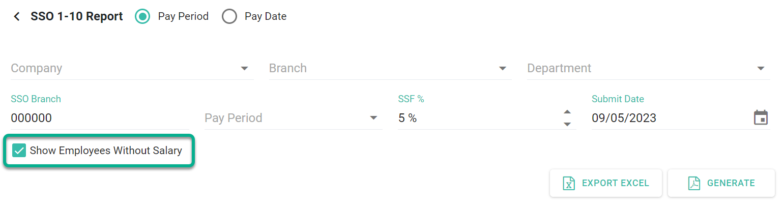 เวลาเรียกรายงานประกันสังคม ให้ติ๊กตรงช่อง "Show Employee without Salary / แสดงพนักงานที่ไม่มีเงินเดือน"