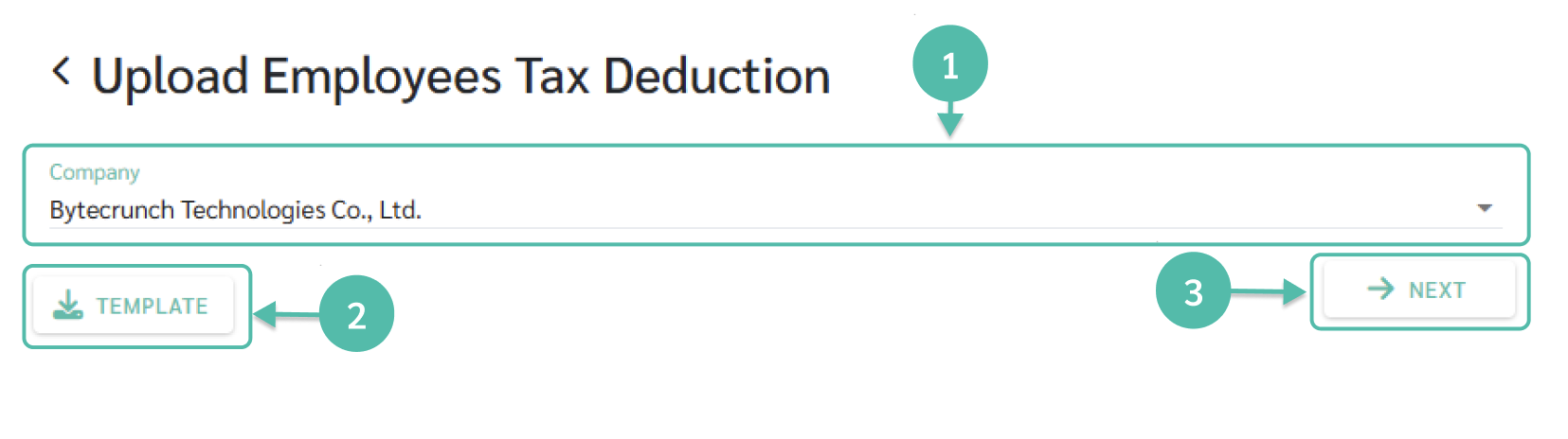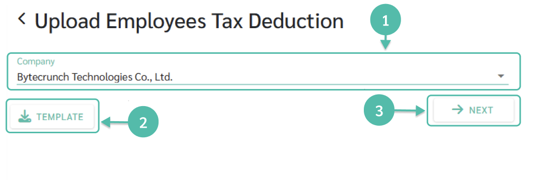 ○ ระบบจะแสดงหน้า อัปโหลดค่าลดหย่อนภาษีพนักงาน (Upload Employees Tax Deduction) เลือก บริษัท (Company) ที่ต้องการอัปโหลดค่าลดหย่อนภาษี จากนั้นกดดาวน์โหลดเทมเพลต เสร็จแล้วคลิกที่ปุ่ม ต่อไป (Next)
