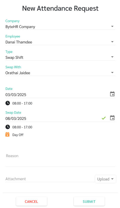 คำร้องขอสลับกะการทำงานสำหรับตารางกะปกติ (Attendance Request - Swap Shift for Normal shift)