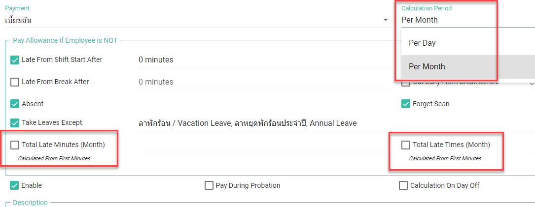 ○ กฏการหักเงินตามประเภทการหัก เช่น มาสาย, กลับก่อน และขาดงาน