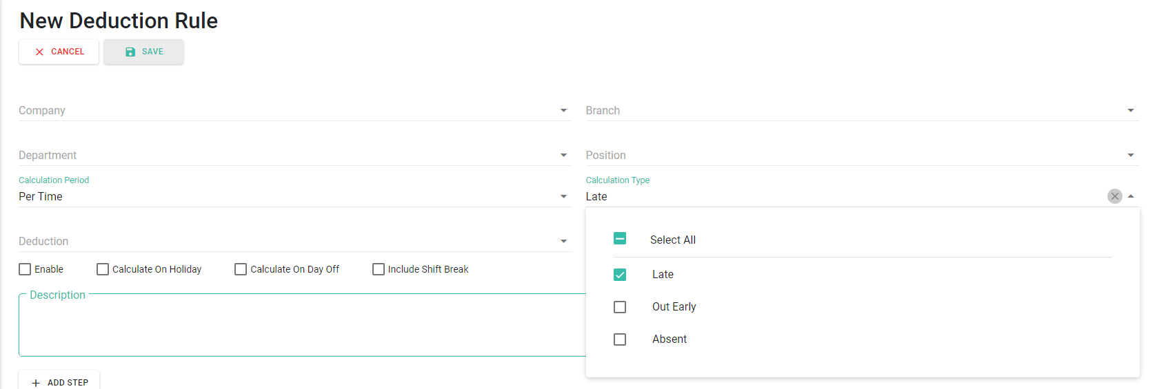 ○ Deduction Rules Calculation Types such as Late, Out Early and Absent