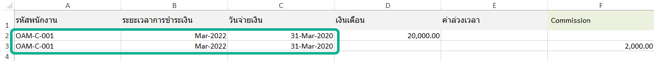 ○ ก่อนอัปโหลดควรตรวจสอบไม่ให้ รหัสพนักงาน (Employee ID) ระยะเวลาการชำระเงิน (Pay Period) และ วันจ่ายเงิน (Pay Date) ซ้ำกันในแต่ละแถว