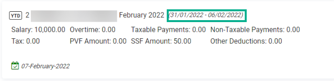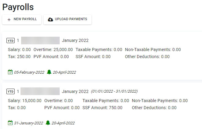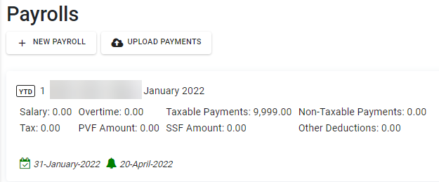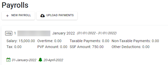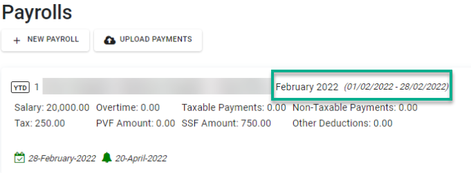 Payroll Block จะแสดงอย่างไรเมื่อมีการอัปโหลด YTD Payrolls 1. กรณีงวดการจ่ายเงินเป็น เดือนละครั้ง Payroll Block จะแสดง เดือน ปี ที่อัปโหลดและช่วงเวลาตามการตั้งค่าเงินเดือน