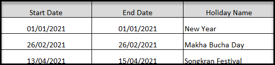 1. คอลัมน์ วันเริ่มต้น (Start Date) ให้ใส่วันเริ่มต้นของวันหยุดนักขัตฤกษ์ (Public Holiday)