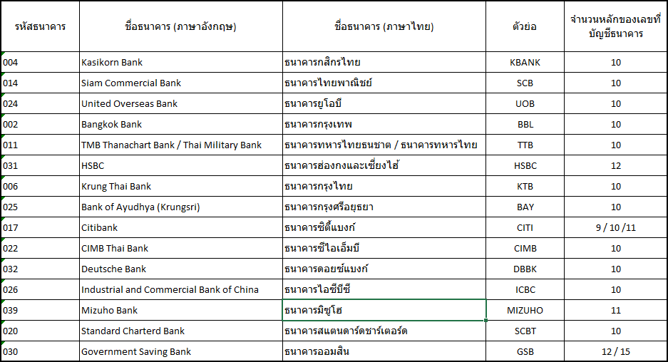 จำนวนหลักของเลขที่บัญชีธนาคาร (Bank Digits) จำนวนหลักของเลขที่บัญชีธนาคารแต่ละธนาคารที่สามารถบันทึกในระบบมีดังนี้