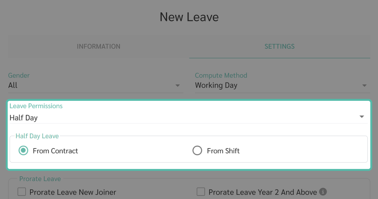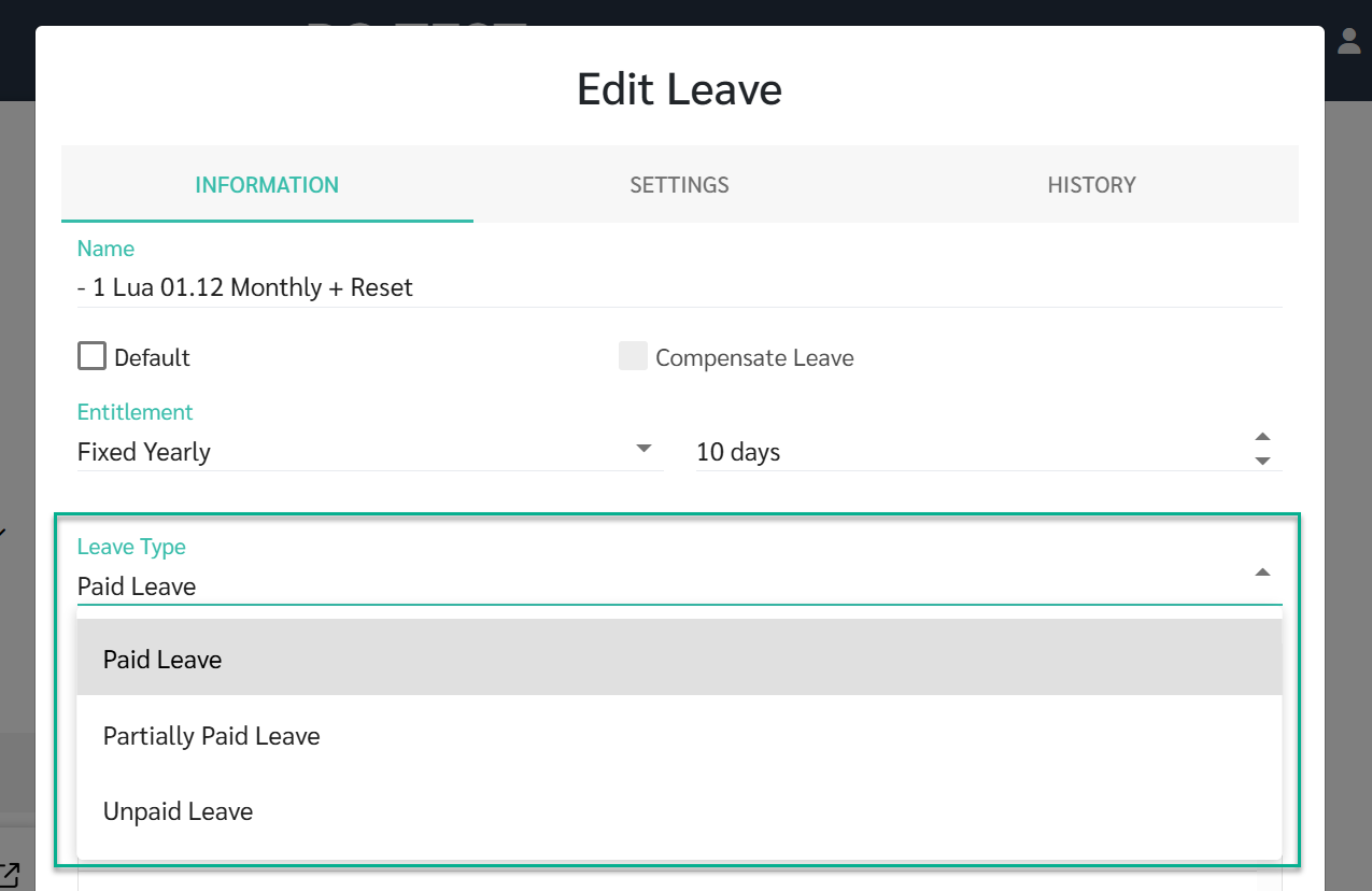 - การลาแบบได้รับค่าจ้างบางส่วน 50% (Partially Paid Leave): การลาประเภทนี้จะถูกบันทึกเป็นวันลาจริงในระบบลา ขณะเดียวกัน ในระบบเงินเดือน วันลาหนึ่งวันจะถูกคำนวณเป็น 0.5 วัน และจ่ายค่าจ้าง 50% ของวันทำงานนั้น การลาประเภทนี้รองรับเฉพาะ การลาเต็มวันเท่านั้น ไม่สามารถลาเป็นรายชั่วโมงหรือครึ่งวันได้