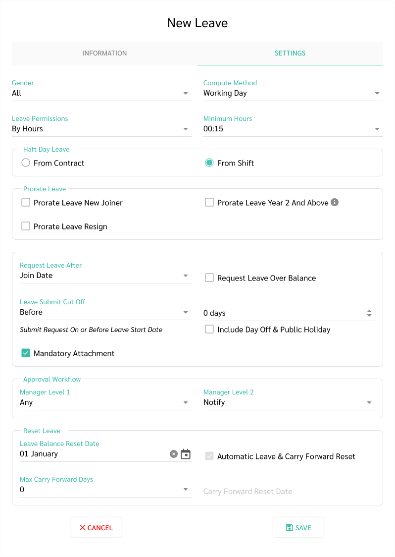 - รีเซ็ตวันลา (Leave Reset) เป็นการกำหนดวันที่ในการรีเซ็ตวันลา และสิทธิวันลาคงเหลือที่อนุญาติให้ยกไปใช้ในปีถัดไป