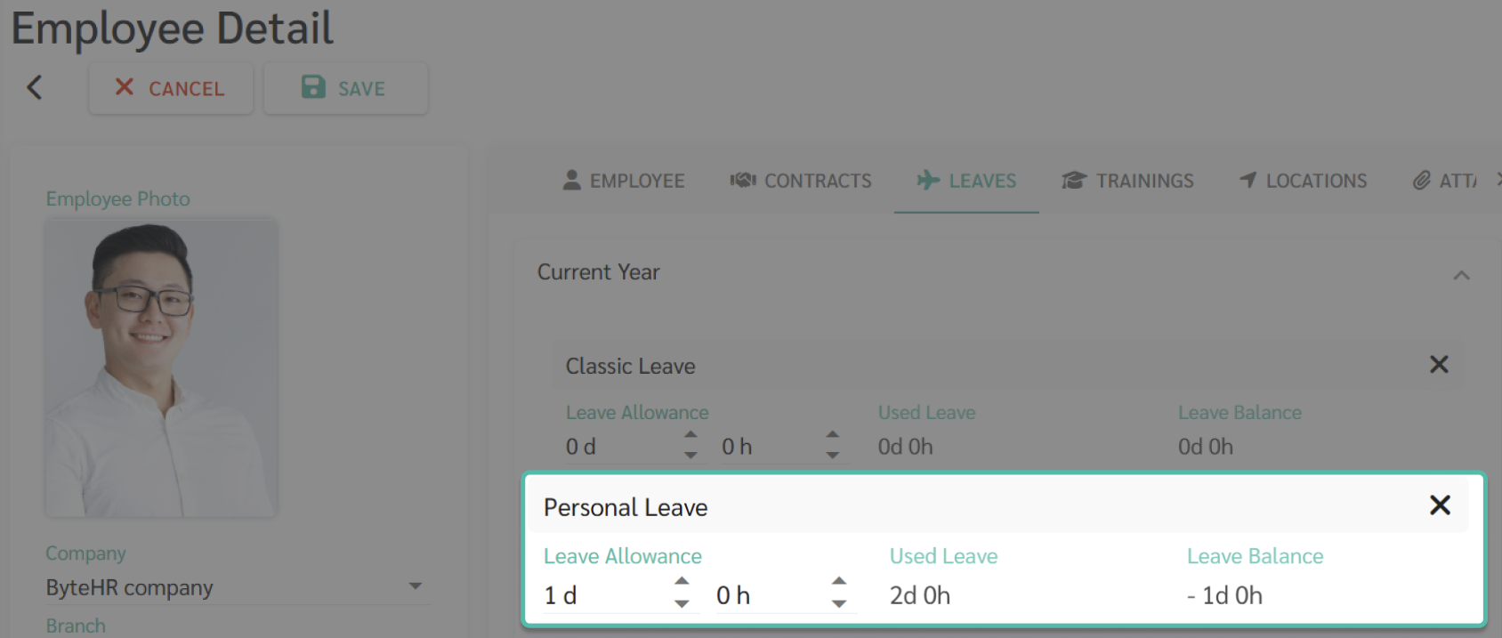 - หากเปิดใช้งาน ระบบจะปรับลดสิทธิวันลาต่อปีและวันลาคงเหลือของพนักงานตามสัดส่วนที่พนักงานควรได้รับจริงเมื่อระบุวันที่สิ้นสุดสัญญาจ้างของพนักงาน