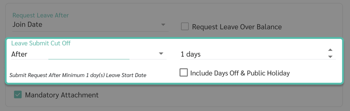 - ร้องขอวันลาได้หลังวันที่ (Request Leave After) กำหนดวันที่พนักงานสามารถเริ่มยื่นคำร้องขอลาได้