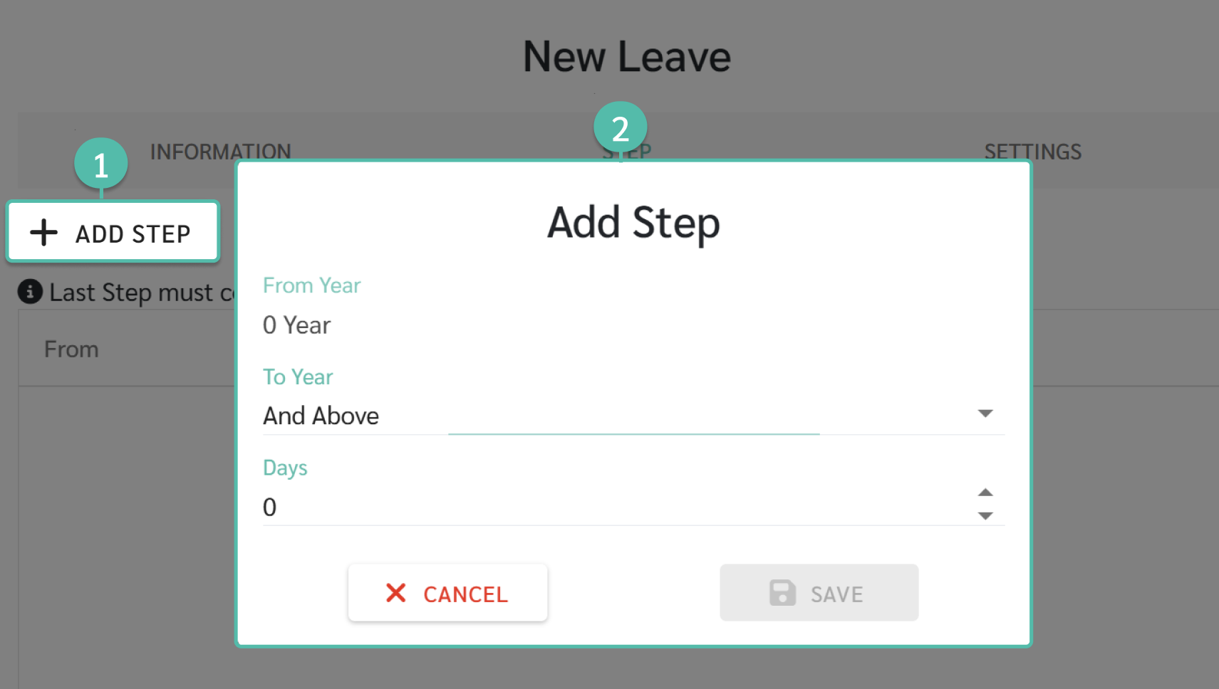 - กรณีที่เลือกสิทธิเป็นแบบขั้นตอน ระบบจะแสดงหน้าต่าง ขั้นตอน (Step) ให้คลิกที่ เพิ่มขั้นตอน (Step) เพื่อใส่จำนวนสิทธิวันลา