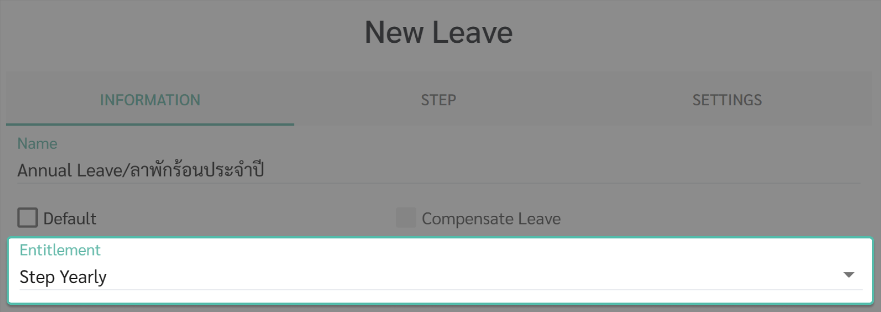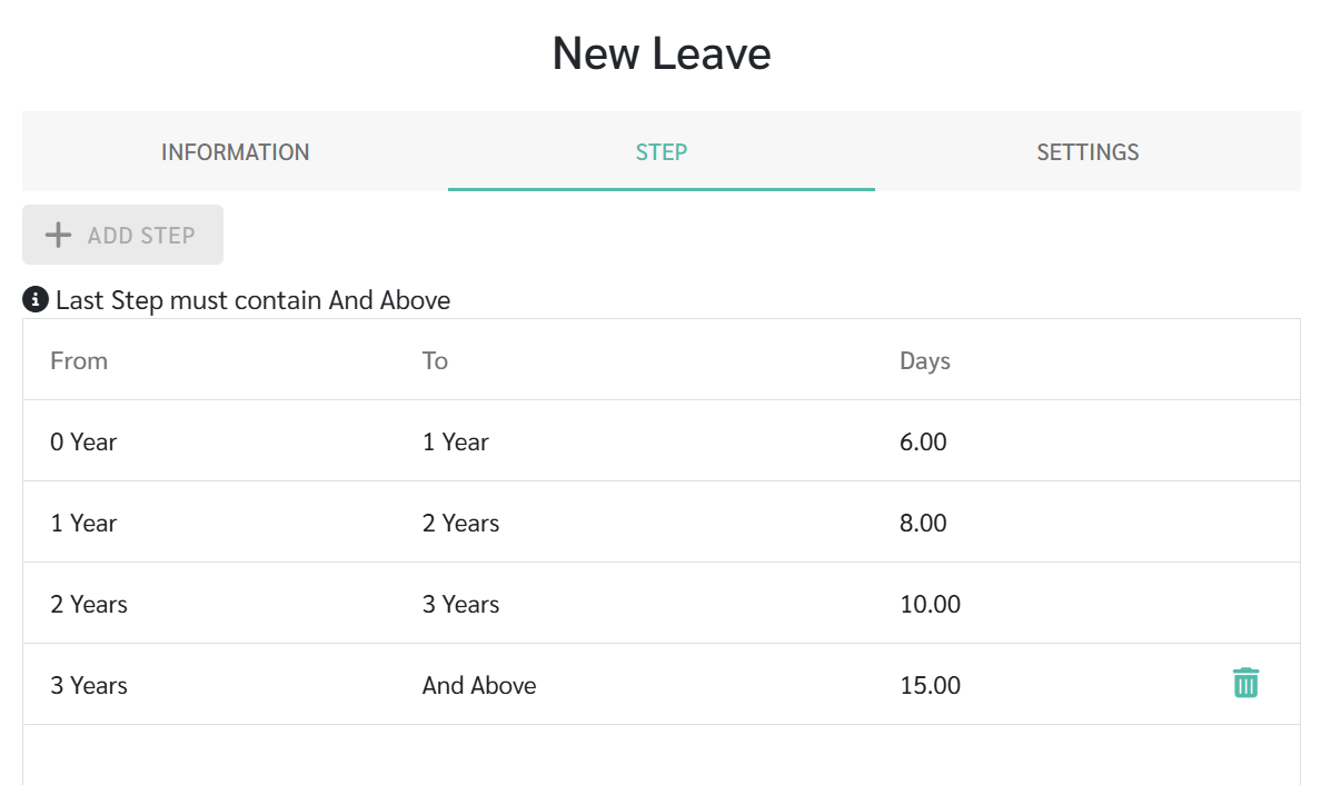 - สำหรับวันลาประเภท ขั้นตอน ต่อปี (Step Yearly) หากเปิดใช้งาน ระบบจะทำการเทียบอายุงานของพนักงานเพื่อเฉลี่ยจำนวนวันลาที่ต้องได้รับในปีนั้น ๆ