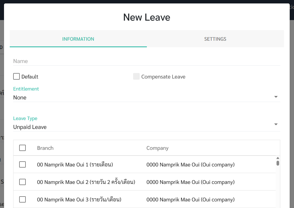 - สาขา (Branch): เลือกสาขาที่ต้องการใช้กับวันลานี้ กรณีที่ไม่มีการติ๊กเลือกสาขาและกดบันทึก หมายความว่าประเภทวันลานี้จะสามารถใช้ได้กับทุกสาขา