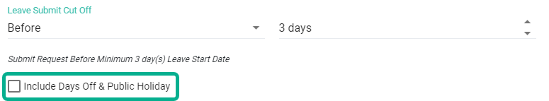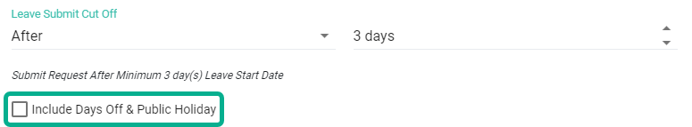 การยื่นคำร้องขอลาสามารถกำหนดวันยื่นล่วงหน้า/ตามหลังโดยให้นับรวมหรือไม่รวมวันหยุดและวันนักขัตฤกษ์ (Options to Include or Not Include Day Off & PH in Leave Submit Cut Off Before/After)