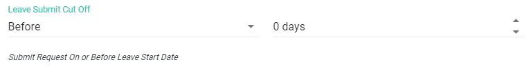 หัวข้อวันลาสามารถตั้งค่า กำหนดวันยื่นคำร้องขอลา (Leave submit Cut Off) ได้ 3 แบบดังนี้ 1. ไม่ (No) หมายถึง ไม่กำหนดให้ต้องยื่นคำร้องขอลาล่วงหน้าก่อนกี่วัน หรือยื่นตามหลังภายในกี่วัน สามารถส่งคำร้องขอลาเมื่อไหร่ก็ได้2. ก่อน(Before) หมายถึง กำหนดให้ยื่นคำร้องขอลาล่วงหน้ากี่วันตามที่ระบุไว้ เช่น ล่วงหน้า 3 วัน เป็นต้น