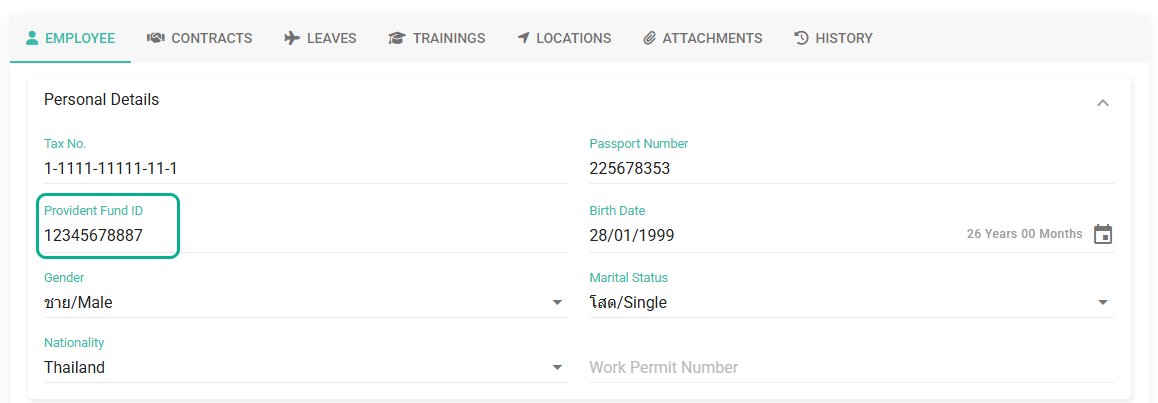 5. ไปที่แถบ พนักงาน (Employees) ใน รายละเอียดพนักงาน (Employee Detail) ระบุหมายเลขสมาชิกกองทุนสำรองเลี้ยงชีพ(Provident Fund ID)