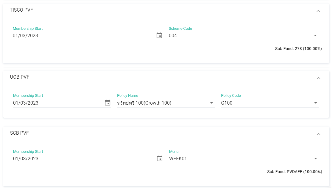- กรณี กองทุนสำรองเลี้ยงชีพ UOB (UOB PVF) อัปเดต วันเข้าเป็นสมาชิก (Membership Start) ชื่อนโยบาย (Policy Name) หรือ ชื่อย่อนโยบาย (Policy Code)
