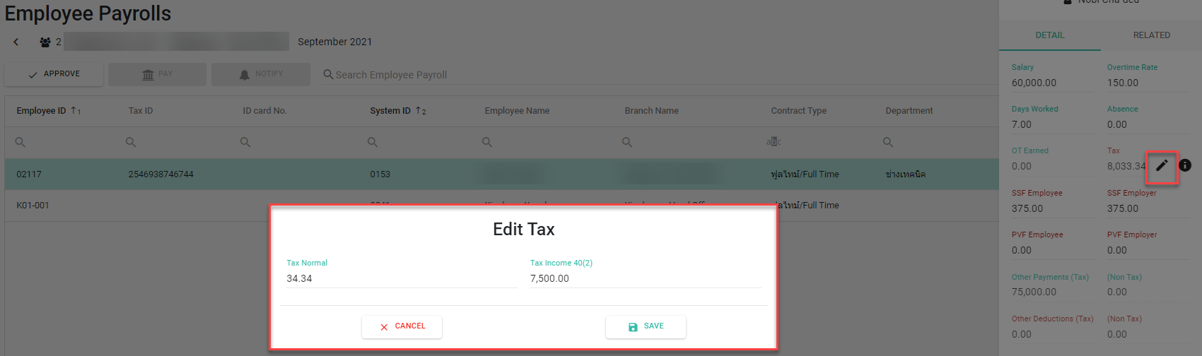 ○ คุณสามารถแก้ไขภาษีในรายละเอียดเงินเดือนสำหรับภาษีปกติและภาษีของเงินได้ 40(2) ได้