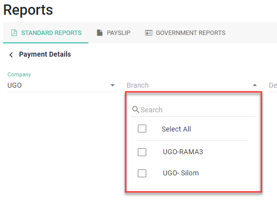 1) Generate Payment Report for Multiple Branches In case Payroll Setting is set at Branch (กรณีที่มีการตั้งค่าเงินเดือนที่สาขา สามารถสร้างรายงานการจ่ายเงินของหลายสาขาได้)