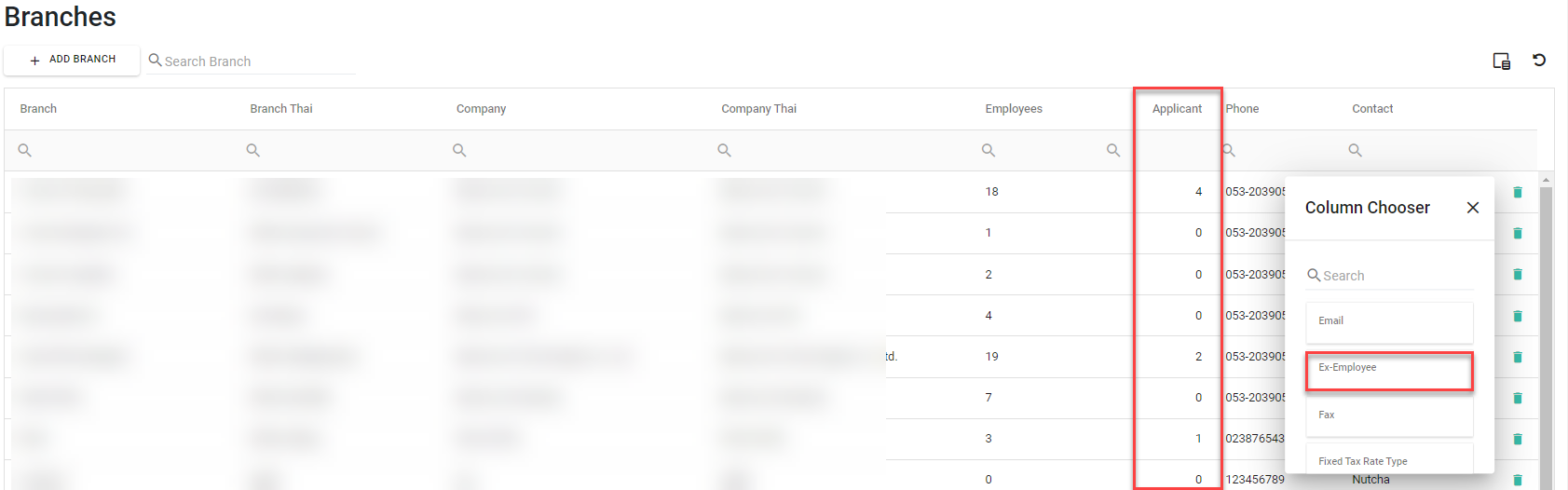 ○ คุณสามารถเลือกผู้สมัคร, อดีตพนักงานจากตัวเลือกคอลัมน์มาแสดงในหน้าสาขาได้