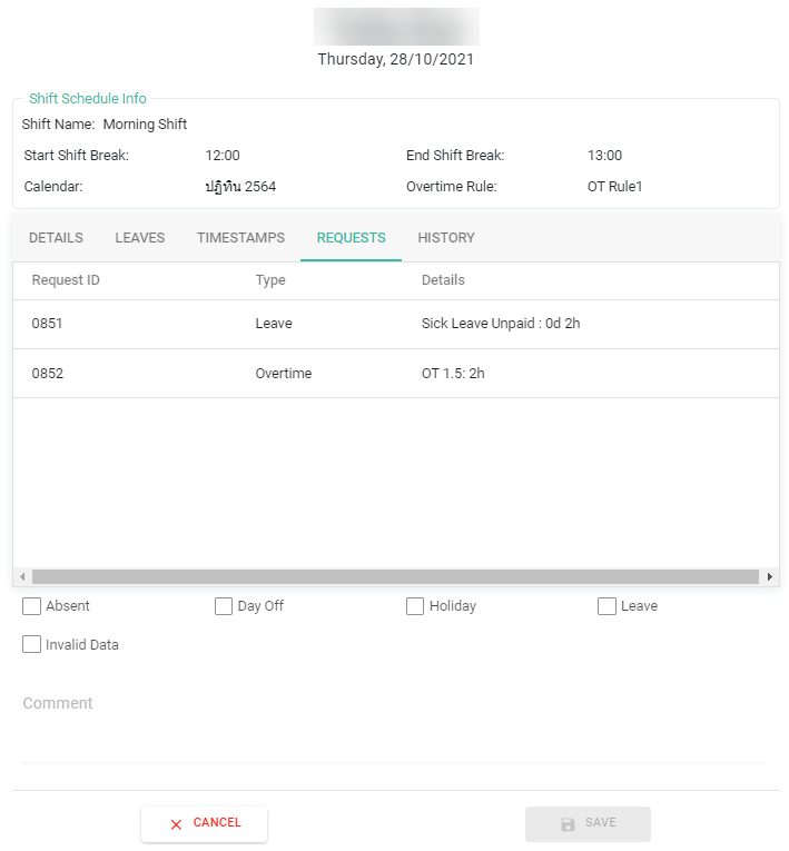 5) Add Requests Tab in Timesheet for Showing Request Details (เพิ่มแถบคำร้องในตารางเวลาเพื่อแสดงรายละเอียดคำร้อง)