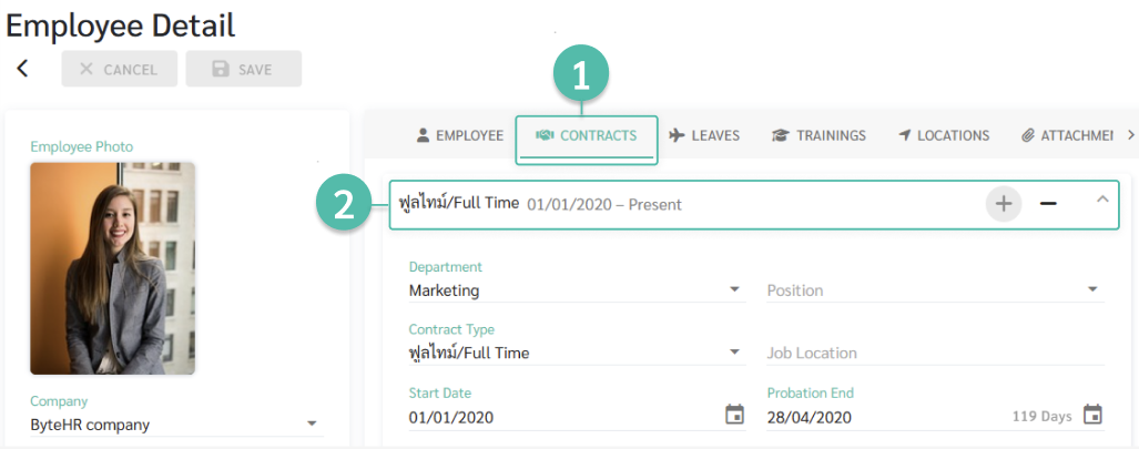 1. ที่หน้ารายละเอียดพนักงาน (Employee Detail) คลิกแถบ สัญญา (Contracts)