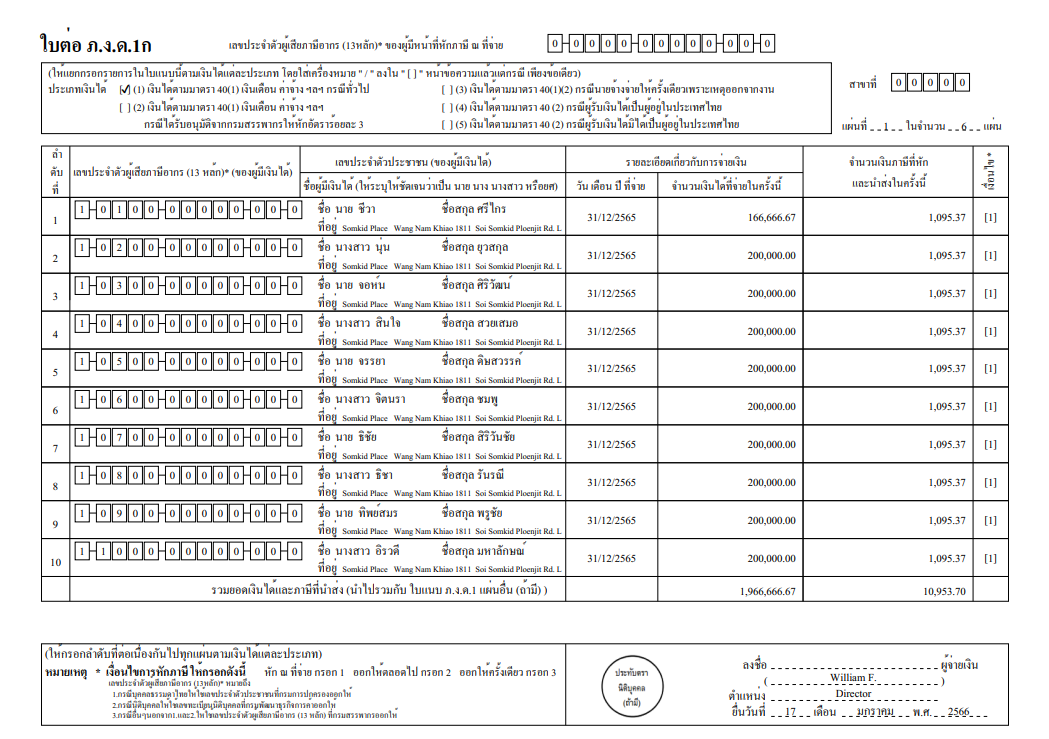 เอกสาร ภ.ง.ด. 1 ก เป็นเอกสารสรุปการจ่ายเงินเดือน ค่าจ้าง เบี้ยเลี้ยง โบนัส สวัสดิการอื่นที่จ่ายให้กับพนักงาน ภาษีที่นายจ้างออกแทนให้ และภาษีของพนักงานรอบรายปี บริษัทจะต้องทำส่งเพื่อแจ้งให้สรรพากร โดยยื่นภายในเดือนกุมภาพันธ์ของปีถัดไป