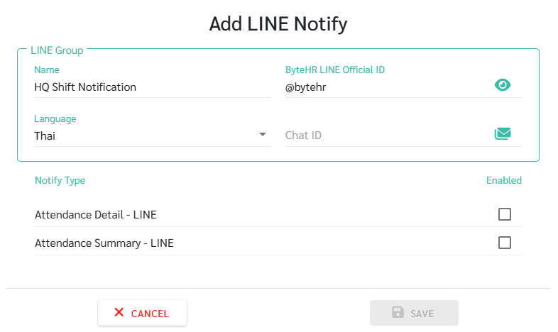 10. หลังจากได้รับ Chat ID แล้วให้ดำเนินการกรอก Chat ID นี้ที่ pop-up เพิ่มการแจ้งเตือนผ่าน LINE(Add LINE Notify) บนเว็บ ByteHR