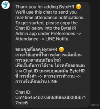 9. ByteHR จะส่งข้อความพร้อมกับรหัส Chat ID